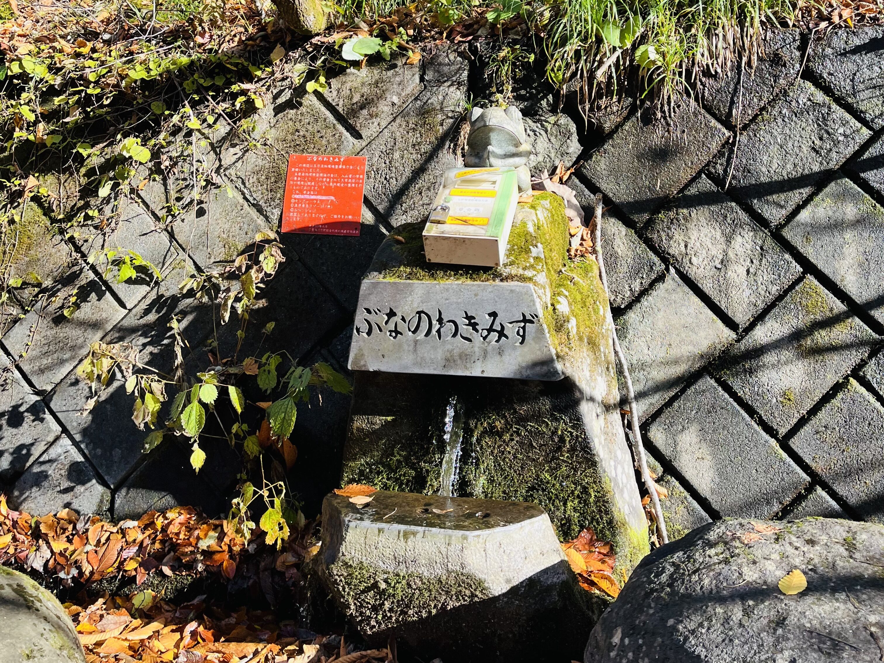 センターハウスから約10分の場所にある「ぶなのわきみず」には、カエルの像が目印です。